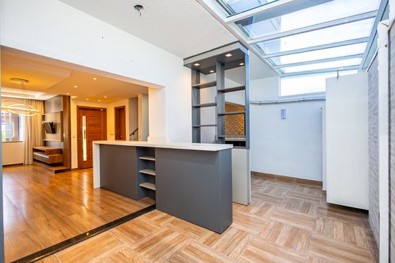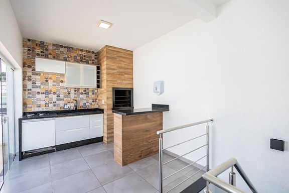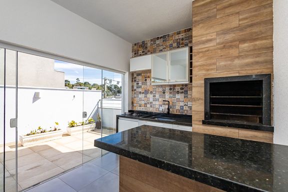 O destaque fica para o pavimento superior, onde um elegante espaço gourmet com churrasqueira se integra a uma vista aberta para o pôr do sol, criando o ambiente perfeito para receber convidados ou desfrutar de momentos exclusivos em família.
